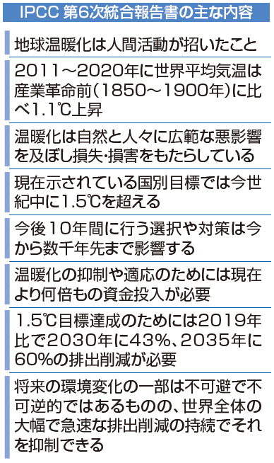 人為的な気候変動が、大気、海洋、雪氷圏、生物圏といった自然と人間に対し、広範で急速な悪影響および損失・損害をもたらしていると指摘。パリ協定の1.5℃目標を達成するには、2021年10月までに発表されている各国の温室効果ガス排出量の削減目標では足りないとした。